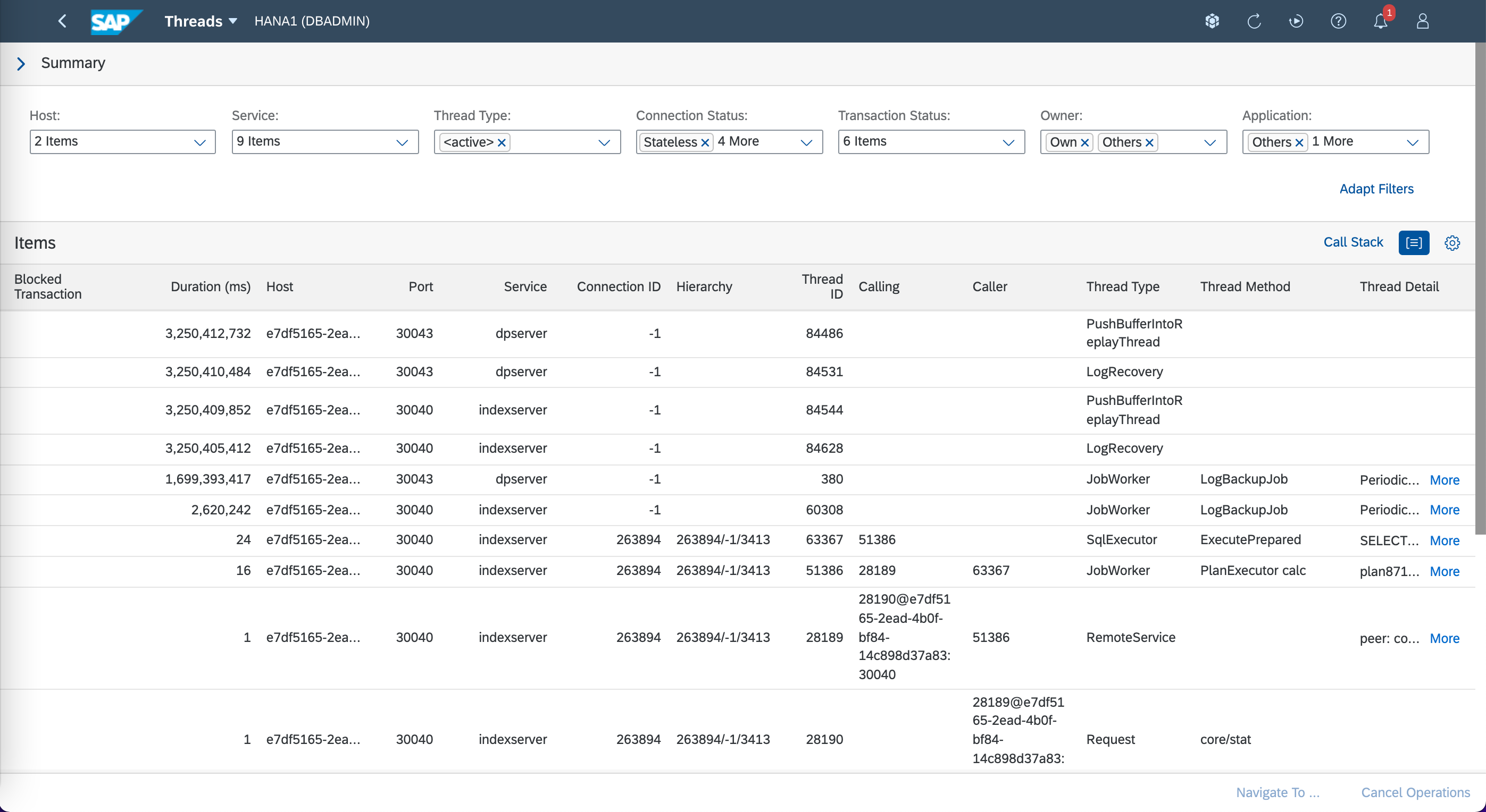 2. "Threads"를 선택하면 HANA database에 전체 Thread 리스트를 조회할 수 있습니다.