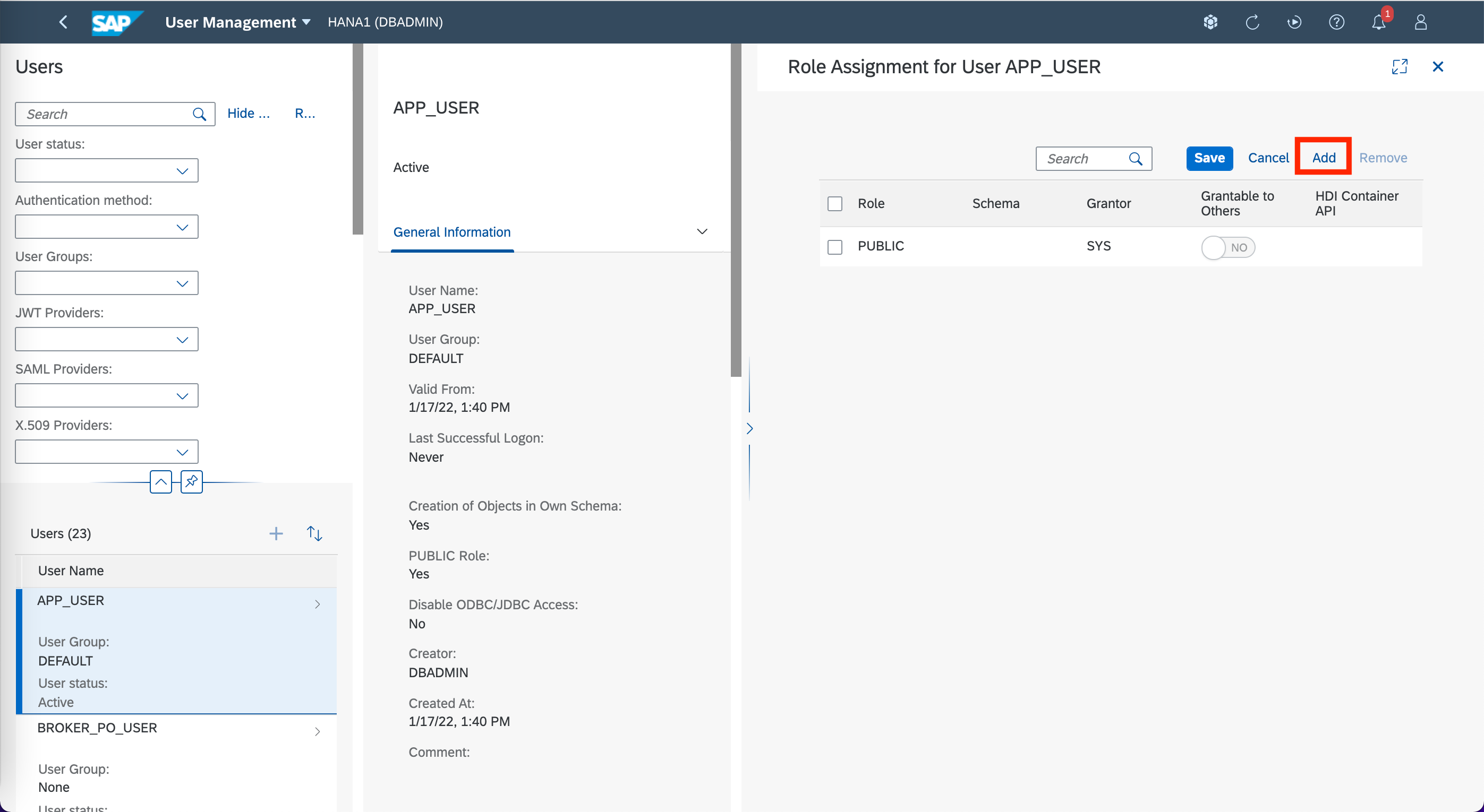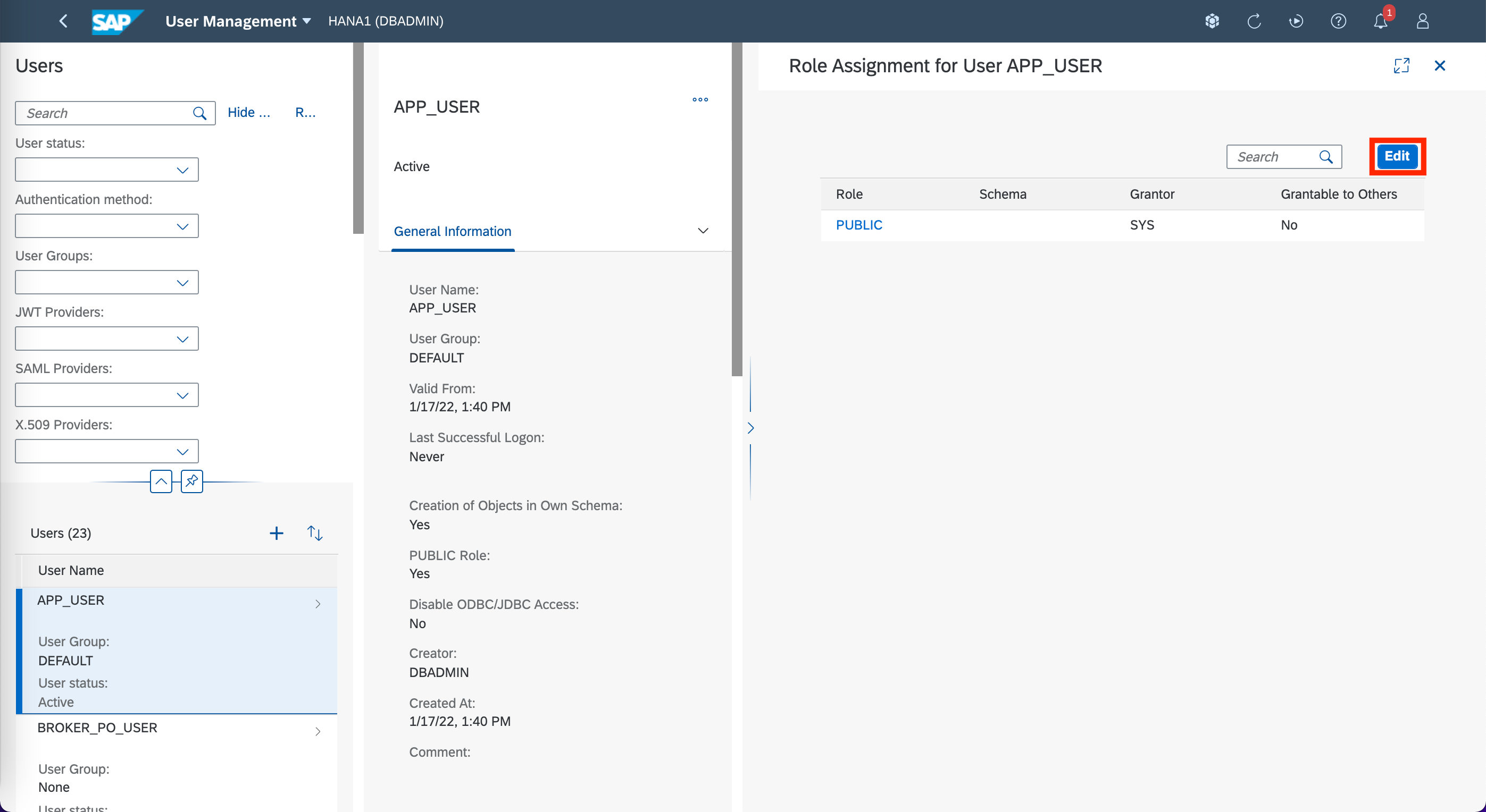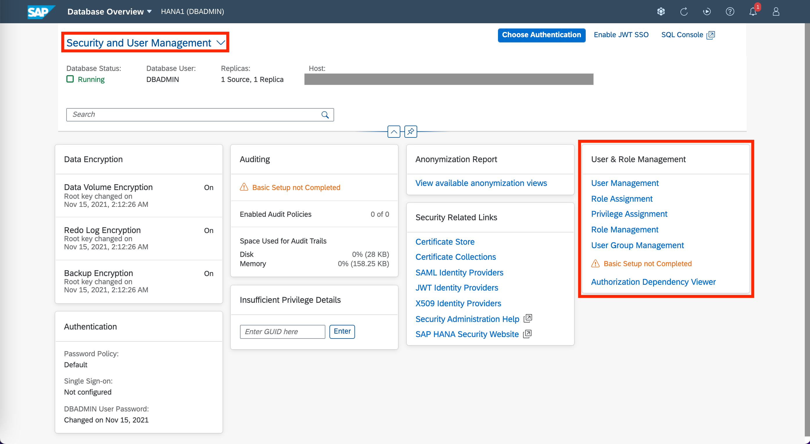 1. SAP HANA Cockpit의 Security and User Management 카테고리에서 "User and Role Management"의 "User Management" 을 통해 조회할 수 있습니다.