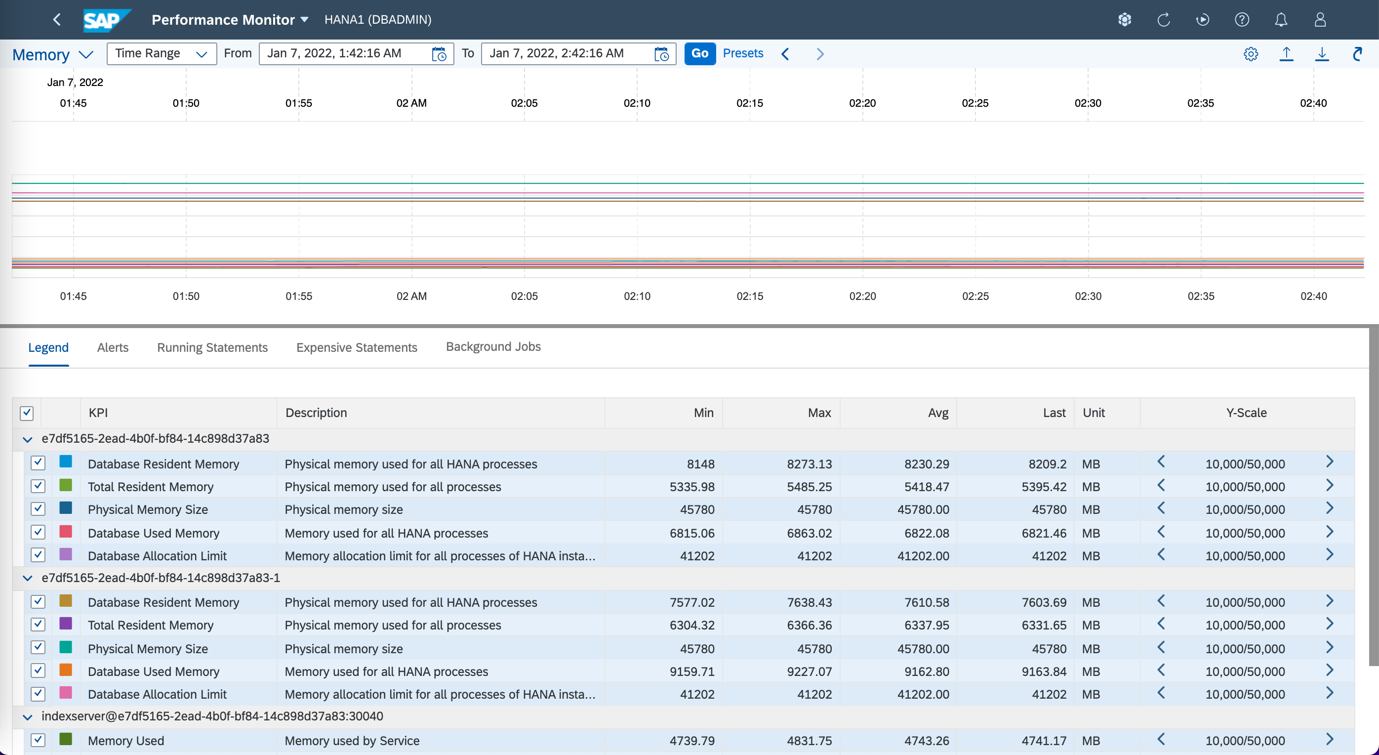 - Resident Memory : HANA database가 시스템으로부터 할당받은 메모리 기준, 할당받은 메모리 중에는 사용하지 않는 Free 메모리 영역도 포함. 빈번한 메모리 할당/반환 프로세스로 인한 부하를 최소화하기 위한 전략